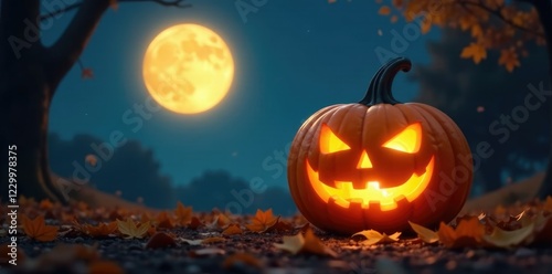Jack o lantern on bright yellow moonlit night, autumn leaves, moonlight