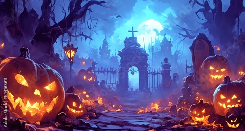 Jack O' Lanterns in a Spooky Graveyard at Night - Halloween Background