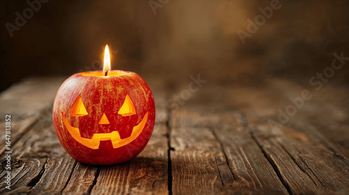 Jack-o'-lantern candle glowing on wooden table for Halloween