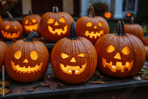Jack-o-lantern Display on a Porch During Halloween Evening Celebration