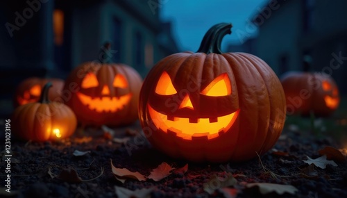 Jack-o-lantern pumpkin carving with eerie glow, nighttime scene, pumpkin lanterns