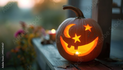 jack-o-lantern, moon, star, carved, pumpkin, halloween, candle, night, skittish, autumn, fall, decoration, holiday, festive, october, tradition, glow, orange, wood, porch, fall foliage, nature, season, celebration, scarey, fun, light, dark, silhouette, mystical