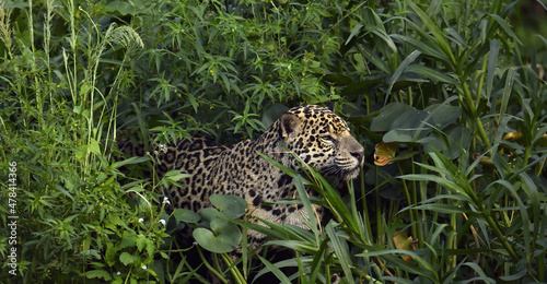 Jaguar in the green thickets of grass. Green natural background . Panthera onca. Natural habitat. Brazil.