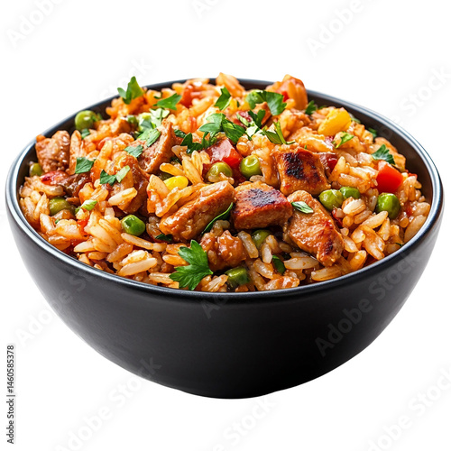 Jambalaya rice food on bowl, isolated [Transparent Background PNG].