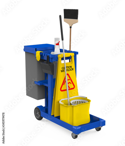 cleaner, cart, concierge, service, cleaning, clean, isolated, bucket, mop, broom, equipment, occupation, brush, dust, working, domestic, men at work, housework, washing, tool, hygiene, maid, cleanup, housekeeping, janitorial, supply, trash, tissue, housekeeper, three-dimensional, render, illustration, blue, glove