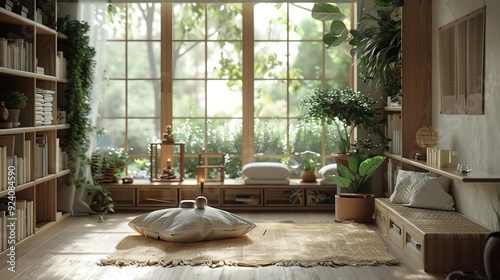 Japandi living room zen corner with buddha statue and meditation cushion on wooden shelves