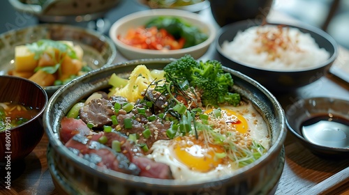 japanese, breakfast, beef, egg, food, meal, cookery, asian, culinary, dining, delicious, healthy, alimentary, vegetable, broccoli, rice, soup, sesame, seed, table