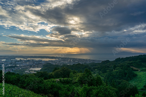 japan, landscape, aerial, sunset, shizuoka, green, sunrise, fuji, beautiful, tour tourism, sky, building, season, park, famous, beauty, scenic, japanese, autumn, silhouette, scene, background, nature, asian, asia, mountain, travel, scenery, countryside, rural, mount fuji, plateau, field, mountain, plantation, tea, haze, fog, cloud, evening