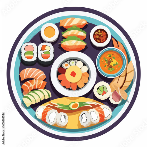 japanese, food, set, cookery, traditional, japan, meal, sushi, sashimi, miso, rice, soup, wasabi, soy sauce, chopstick, bento, seafood, maki, plate, tempura, green tea, asian, culture, delicacy, fresh, culinary, garnish, epicure, side dish, teriyaki, oriental, fish, vegetable, cultural, delicious, authentic, illustration, vector, presentation, minimal, serving, eatery, tray