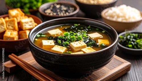 Japanese Miso Soup, Additional Ingredients Such As Green Onion, Wakame Seaweed, And Fried Tofu.