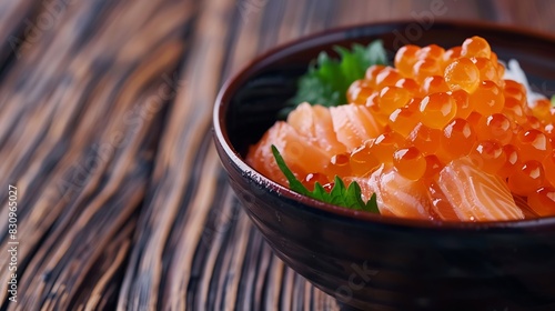 Japanese mix seafood sashimi don Fresh salmon sashimi don Raw salmon roe and wasabi Japanese food on restaurant table Isolate on wood background : Generative AI