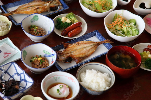 breakfast, assorted, assortment, japanese, japan, dish, food, fish, traditional, raw, healthy, diet, meal, plate, hotel, authentic, cooked, cookery, delicious, miso soup, egg, grilled, salad, seaweed, fermented, soybean, sardine, horse, mackerel