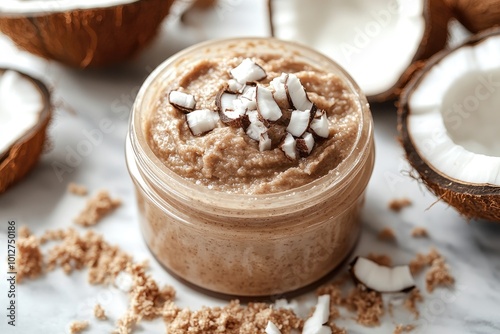 coconut, scrub, organic, natural, beauty, skincare, cosmetic, product, ingredient, homemade, bricolage, healthy, treatment, spa, wellness, exfoliate, exfoliating, moisturise, hydratation, skincare, bodycare, fresh, tropical, exotic, white, brown, jar, background, closeup, copy space