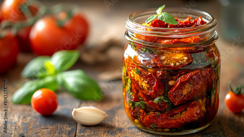 sun-dried, tomatoes, jar, preserved, canned, homemade, organic, mediterranean, culinary, rustic, epicure, healthy, ingredient, basil, garlic, delicious, savoury, herb, appetising, artisan