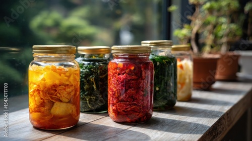 Jars of colorful pickled vegetables like kimchi and preserved greens are lined up on a wooden ill bathed in soft natural light from a sunny day outside.