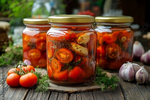 Jars of Pickled Tomatoes and Herbs on Rustic Wooden Surface