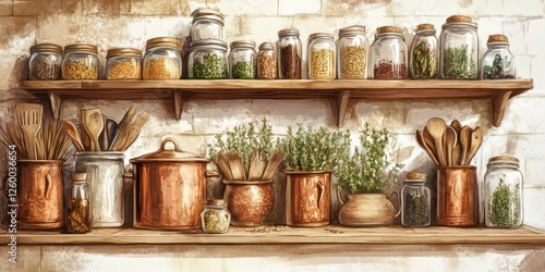 jar, spice, herb, wooden, shelf, kitchen, utensil, cooking, copper, pot, pantry, rustic, vintage, retro, food, ingredient, culinary, favor, thyme, spoon, container, storage, organisation, brick, wall, natural, light, earthy, tone, still, life, arrangement, countertop, glassware, preserve, canned, homemade, shelf, display, kitchen utensile, art, decoration, plant, collection