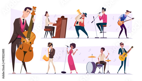 Jazz band. Cartoon musicians characters playing on guitar sax and piano performance persons exact vector set