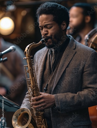 Jazz musician passionately playing saxophone during a live performance in a cozy venue
