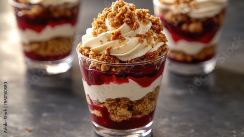Jelly and cream layered in a dessert cup, with a cookie crumble topping