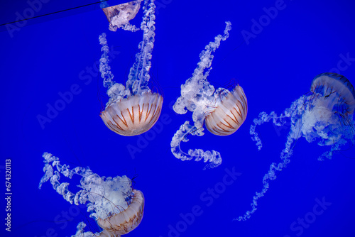 Jelly fish on colorful background in an aquarium in Toronto, Canada