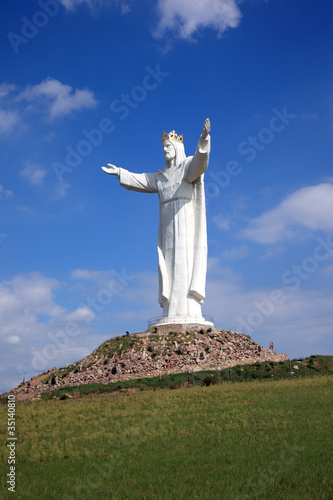 destination, crucified, important, sculpture, historical building, religion, outdoors, catholic, landmark, tour tourism, massive, pilgrim, jesus christ, famous, heaven, poland, symbol, statue, travel, polish, front, jesus christ, crown, cloud, white, stone, photo, cross, trip, huge, king, blue, face, icon, view, robe, big, sky