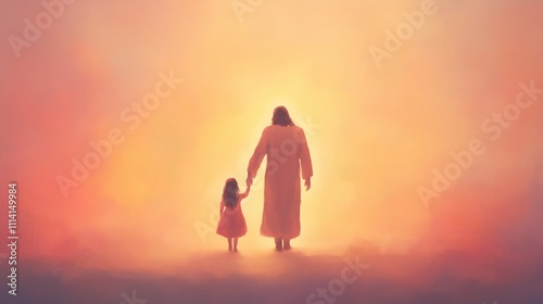jesus christ, spirituality, little girl, guidance, peace, illustration, serenity, backview, warm colors, companionship, faith, divine, dreamlike, mist, backlit, calm, symbolic, children, connection, aethereal, tranquil, inspirational, hope, comforting, presence, warmth, biblical, nurturing, peaceful, oneness, love, gentle, nirvana, heavenly, harmonious, innocence, journey, mysterious, spiritual, heartwarming, softness, impressionistic