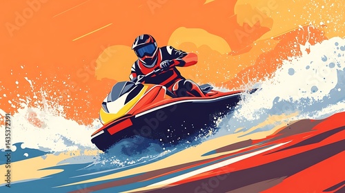 jet ski, jet ski, watercraft, extreme sport, water sport, ocean, sea, sunset, sunrise, wave, splash, speed, adrenalin, adventure, rider, driver, man, male, sport, action, summer, beach, water, aquatic, vibrant, colourful, illustration, graphic, vector, design, artwork, dynamic, energy, fast, competition, racing, lifestyle, recreation, hobby, trendy