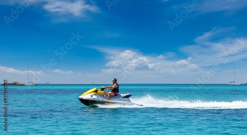 jet, ski, speeding, crystal, clear, blue, water, bright, sky, dynamic, action, high speed, thrilling, adventure, water, sport, vibrant, scenery, exciting, summer, sleek, energetic, motion, splash, refreshing, scenic, horizon, fast, sea, boat, beach, ocean, island, travel, coast, tropical, landscape, nature, vacation, holiday, ship, sand, fishing, turquoise, sun, yacht, caribbean, tour tourism