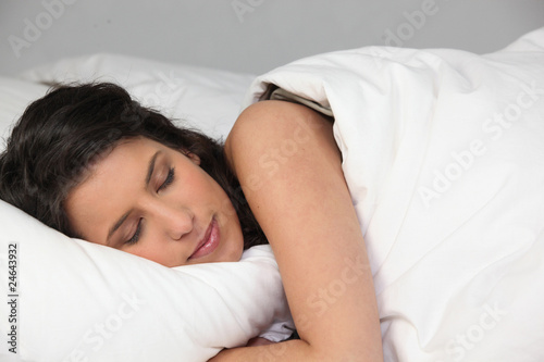 beauty, wellness, young, woman, brown-haired, cute, pretty, asleep, dormant, sleep, long, rest, relaxed, eye, closed, close, bed, rest, bedchamber, house, interior, caucasian, front view