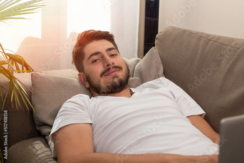 man, couch, relax, notebook, work, rest, filming, long, sofa, living room, napping, serene, serenity, calm, calmness, rest, online, cyberspace, young, barbed, beauty, smile, house, housework, student, work, smiling, person, relaxing, luck, nonchalant, interior, lifestyle, looking