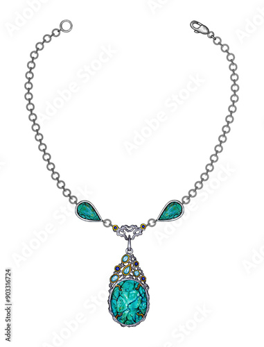 Jewelry design fancy art necklace set with gems and turquoise hand drawing on paper.