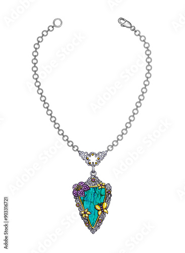 Jewelry design nature fancy art necklace set with gems and turquoise hand drawing on paper.