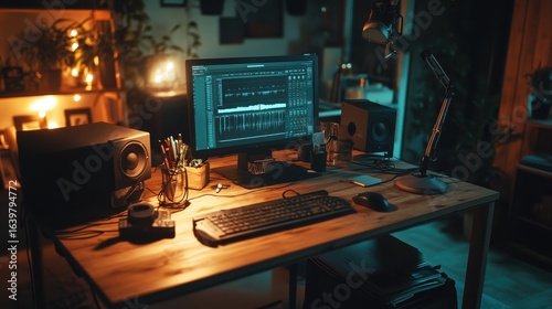 Jib down shot of wooden desk in studio with podcast gear technology recording sound for social media channel production. Live broadcasting space with specialized tech in dimly lit apartment