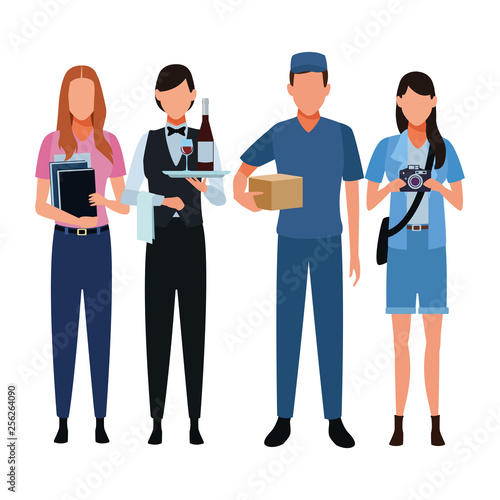 job, profession, teacher, waiter, courier, photographer, woman, man, professional, men at work, faceless, vector, illustration, job, occupation, profession, occupation, people, work, person, isolated, labor, cartoon, human, service, character, industrial, different, career, manager, employment, adult, employee, recruitment, concept, communication, search, signs, company, interview, meeting, hiring