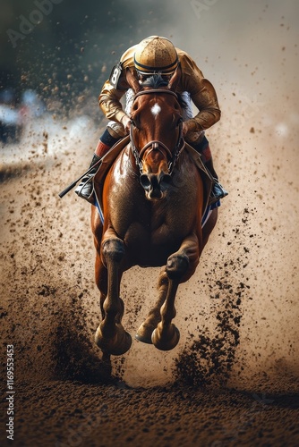 Jockey racing on a horse during sunset on a dirt track, dust swirling around in the air