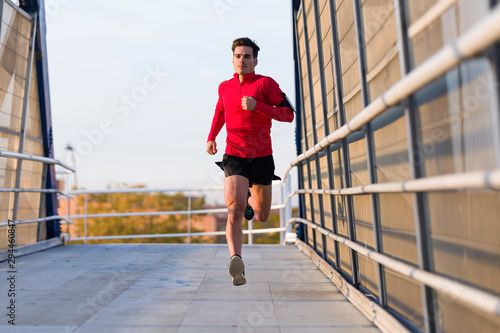 jogger, smartphone, arm, pocket, running, bridge, caucasian, alone, 1, people, young, man, outdoors, red, day, determination, healthy lifestyle, goal, challenge, athlete, leisure, training, physical exercise, exercise, fit, vitality, wireless, mobility, technology, mobile phone, accessibility, black hair, activewear, front view, full-length, adult, spain, health, healthy, sport, fitness, jogging, communication