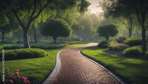 Jogging track in a garden surrounded by green trees, flower shrubs, and bushes, with a black asphalt concrete walkway adjacent to a well-maintained green grass lawn.