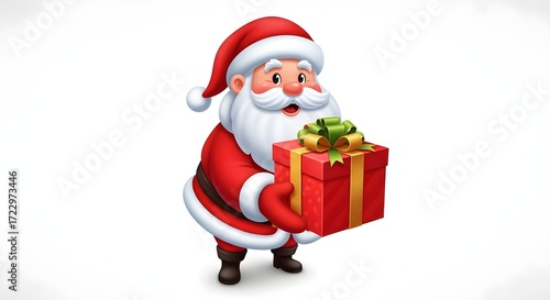Jolly Santa Claus in classic red suit holding a beautifully wrapped present with a green bow, set against a clean white background, symbolizing the spirit of giving and Christmas joy.