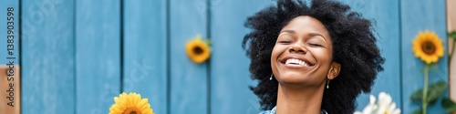 joyful, african, female, sunflower, smiling, blue, background, happy, cheerful, nature, field, spring, summer, relaxed, content, carefree, serene, floral, vibrant, energy, positivity, sunny, garden, day, wellness, fresh, beauty, happiness, peaceful, bright, afro, coiffure, casual attire, style, earring, fashion, youth, life, plant, environment, warm, sky, sunshine