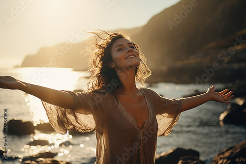 Joyful beautiful woman on the beach taking the sun on her vacations