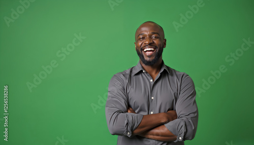 Joyful black man stands with arms crossed against green screen. Expression radiates happiness, laugh, pride. Elegantly dressed subject confident, attractive, modern with authentic natural smile.
