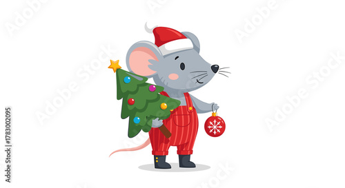 Joyful cartoon mouse in Santa hat and overalls carries decorated Christmas tree and ornament, celebrating holiday spirit with festive cheer and winter wonder