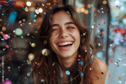 Joyful Celebration: A Young Woman Laughing Amidst Colorful Confetti