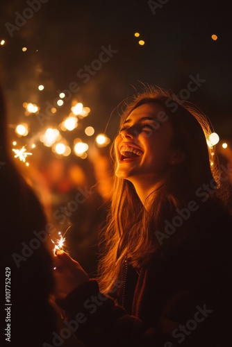 Joyful celebration at night as a young woman admires sparklers with friends during a festive gathering