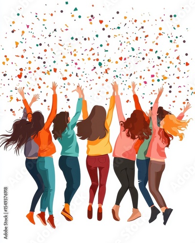 celebration, friends, happiness, confetti, joy, party, togetherness, excitement, woman, casual attire, diversity, fun, laughter, oneness, colourful, event, festive, cheerful, group, lifestyle, young, vibrant, playfulness, arm, upward, friendship, background, female, season, creativity, motion, style, energy, smiling, indoor, gathering, colours, atmosphere, carefree, expression, enjoyment, moment, connection, team, leisure