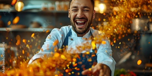 chef, cooking, flames, kitchen, joyful, commercial, professional, culinary, performance, excited, male, spice, dynamic, passion, food, preparation, eatery, epicure, action, happiness, cookware, uniform, skill, fire, motion, heat, lifestyle, smile, energetic, enthusiasm, culinary arts, food industry, ai