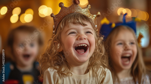 girl, children, laughter, crown, celebration, happiness, friends, joy, party, smiling, indoor, festive, playful, cheerful, curly, hair, bright, colourful, fun, youth, innocence, expression, joyfulness, childhood, togetherness, event, excitement, girl, colours, gold, joyful, candid, closeup, portrait, warm, bokeh, background, atmosphere, expression, children, face, moment, memory, friendship