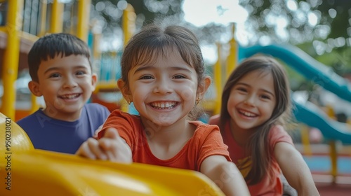 Joyful children playing together, Children playing, Children of different backgrounds playing joyfully in a playground, vibrant colors and dynamic motion capturing their happiness