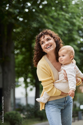 joyful curly woman holding toddler daughter on city street and looking away, bonding moments